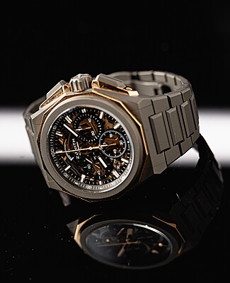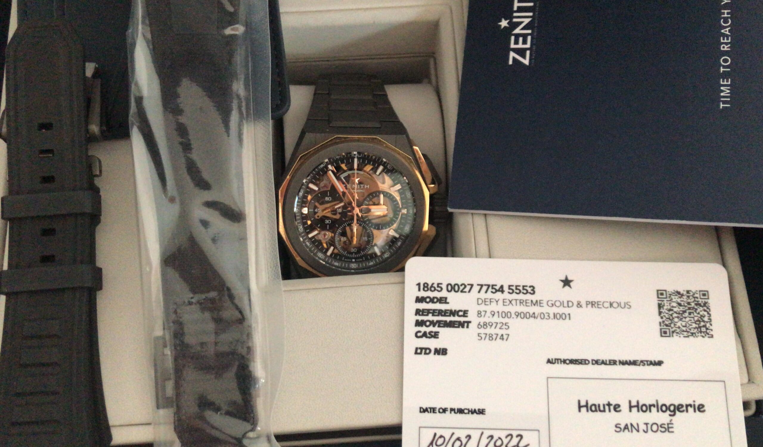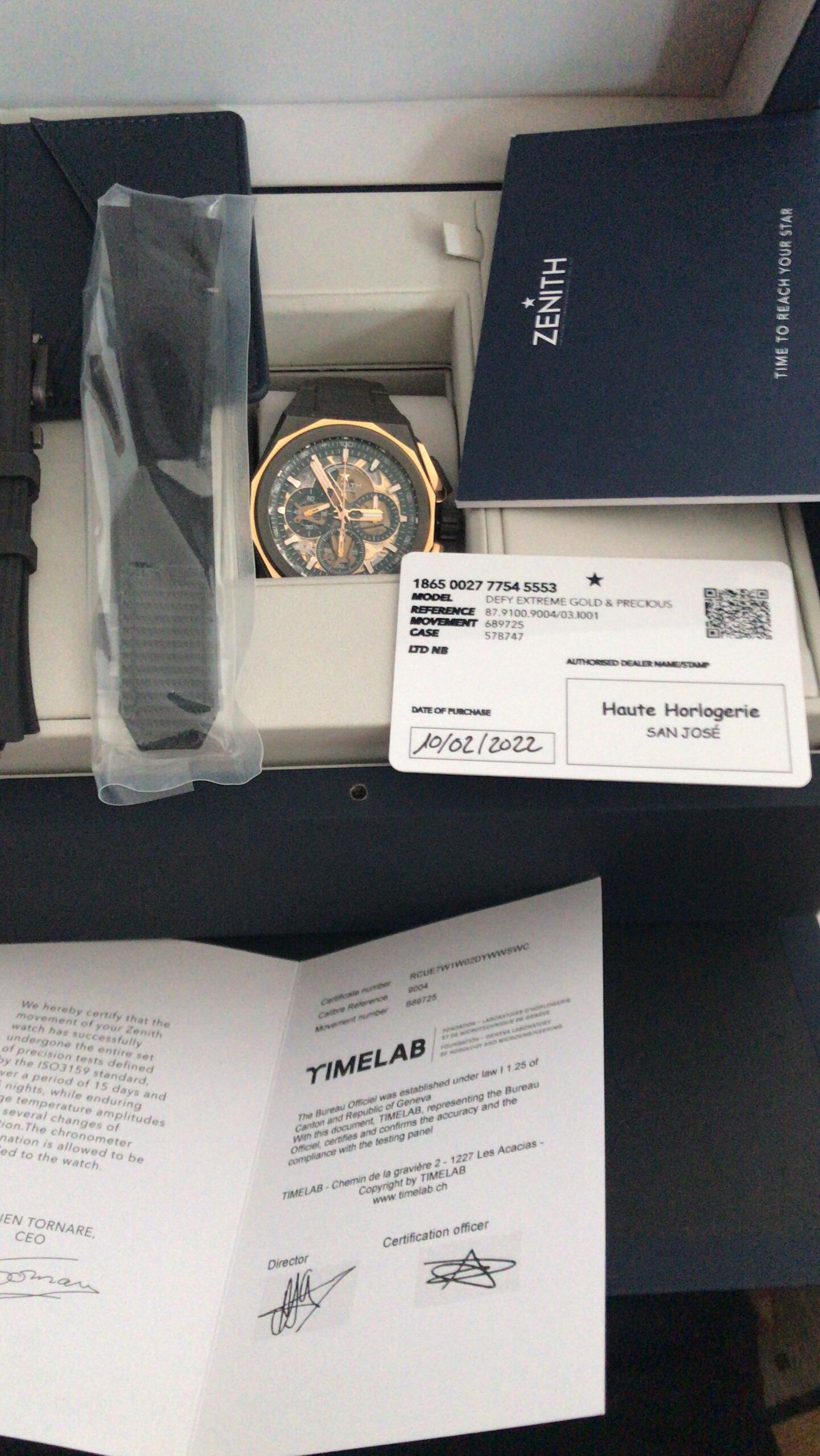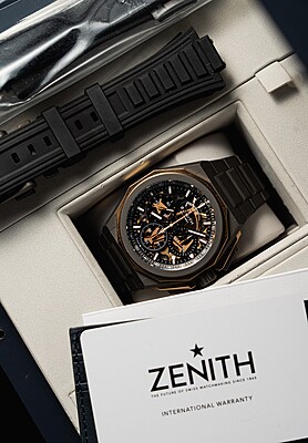 This Zenith watch model 87.9100.9004/03.I001 from 2022 is a refined timepiece that has been recently serviced, ensuring its optimal performance and accuracy. It comes complete with its original card and box, making it a valuable addition to any watch collection.