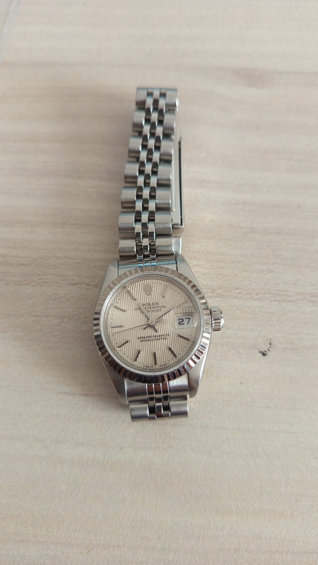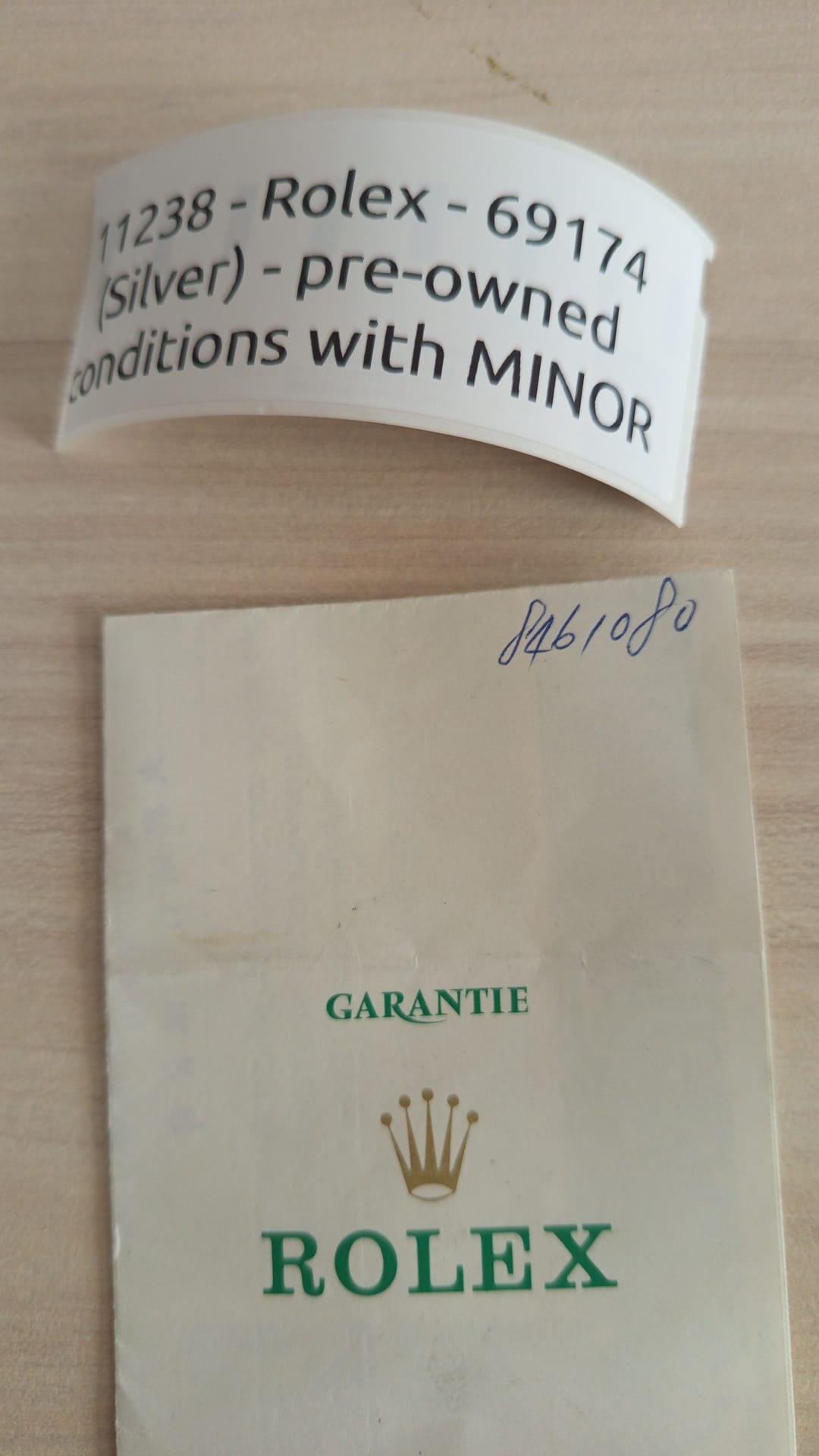 Introducing the elegant Rolex 69174 in Silver, a pre-owned timepiece showcasing timeless sophistication with MINOR signs of usage. This exquisite watch comes complete with its card, adding to its prestige and collectibility. Ideal for those seeking a luxury watch with a touch of character and charm.
