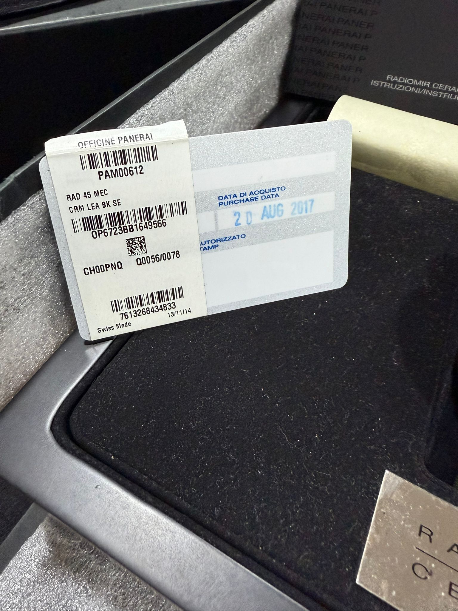 Introducing the Panerai PAM00612, a pre-owned timepiece in excellent condition with only minor signs of wear. This stunning watch comes complete with its original card and box, making it a must-have for any watch collector. With its sleek design and impeccable craftsmanship, this Panerai timepiece is sure to make a statement on any wrist.