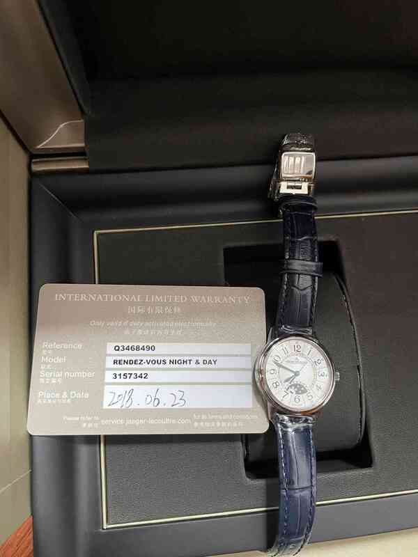 This Jaeger-LeCoultre watch, model Q3468490, is a pre-owned timepiece in excellent condition with minor signs of usage. It comes with its original card and box, making it a great choice for collectors or watch enthusiasts looking for a quality timepiece with a touch of elegance.