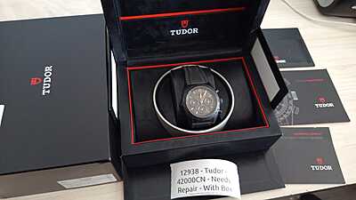 This Tudor 42000CN watch has been recently serviced, ensuring its functionality and performance. It comes complete with its original box, adding to its collectible value and convenience for storage or gifting. A timeless timepiece that combines both style and reliability.