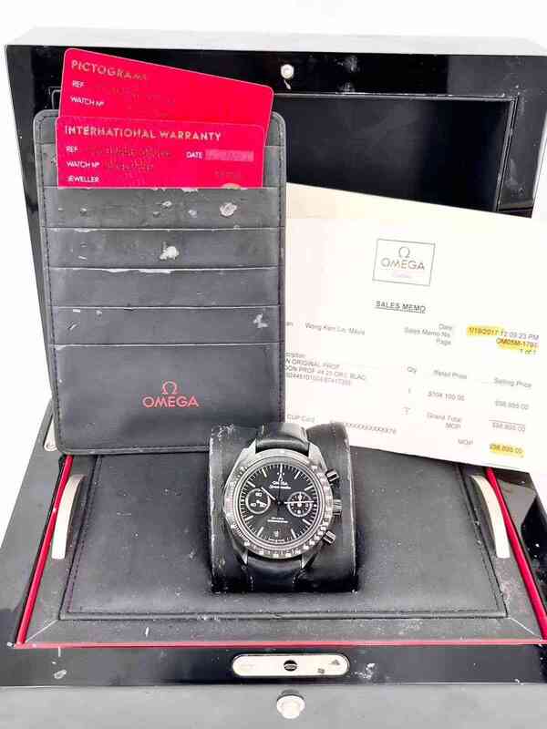 This Omega Dark Side of the Moon watch in pre-owned condition features a sleek and innovative design with minor signs of usage, making it a unique and stylish timepiece. It comes with its card and box, adding to its collectability and value. A perfect choice for watch enthusiasts looking for a balance between luxury and…