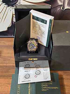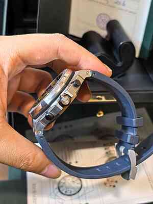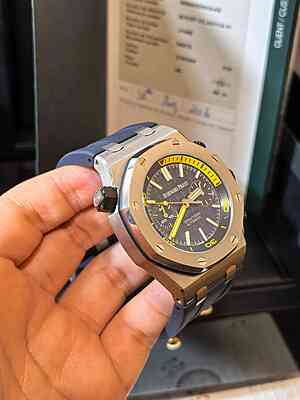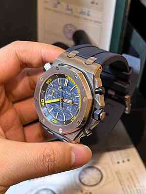 Introducing the Audemars Piguet Royal Oak Offshore 26703ST.OO.A027CA.01 in a striking blue colorway from 2016. This pre-owned timepiece is in excellent condition with only minor signs of usage. It comes complete with the card and box, making it a great addition to any luxury watch collection.