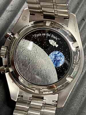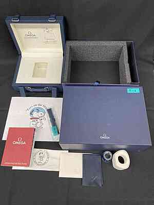 This Omega watch model 310.32.42.50.02.001 features a playful Snoopy design on both bracelet and included strap. Despite being pre-owned, it is in excellent condition with only minor signs of usage. It comes with its original card and box, adding to its collectible value.