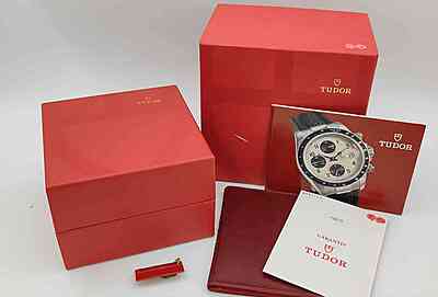 This Tudor 79270 timepiece, featuring a striking black dial with tiger stripe pattern, is a pre-owned watch in excellent condition with only minor signs of previous usage. It comes complete with its original card and box, making it a great addition to any watch collection.